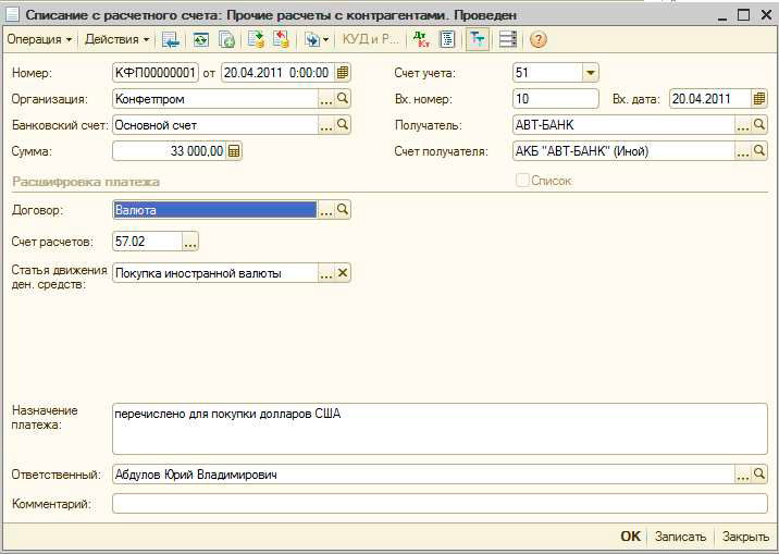 1. Перечисление денежных средств на приобретение иностранной валюты регистрируется документом «Списание с расчетного счета» для операции Прочие расчеты с контрагентами. Перечисление средств происходит в рублях, соответственно в качестве счета учета указываем 51 «Расчетный счет». Также указываются рублевые банковские счета. Договор с контрагентом в данном случае должен иметь вид Прочие, валютой взаиморасчетов договора должен быть рубль. В качестве Счета расчетов устанавливаем 57.02 «Приобретение иностранной валюты».