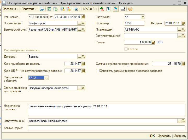 2. Операция зачисления приобретенной валюты на валютный счет организации регистрируется документом «Поступления на расчетный счет» для операции Приобретение иностранной валюты. Валюта приходуется на бухгалтерский счет 52 «Валютные счета», указываются валютные банковские счета организации и банка. В реквизите Курс приобретения валюты указывается курс покупки. Сумма в рублях по курсу покупки подсчитывается автоматически как произведение суммы приобретенной валюты на курс покупки. К бухгалтерскому учету приобретенная валюта принимается по курсу ЦБ РФ. Этот курс программа показывает в реквизите «Курс ЦБ РФ на дату приобретения валюты» (по данным справочника «Валюты»). На основе этой информации при проведении документа в бухгалтерском учете вводятся проводки по зачислению приобретенной валюты на счет их учета, а так же по учету прибыли или убытка (прочих доходов или расходов) от операции за счет разницы курсов в корреспонденции со счетом 57.02. Если на валютном счете имеются остатки денежных средств, то производиться их перерасчет и формирование еще одной проводки на выявленную курсовую разницу. В налоговом учете (в ресурсе Сумма НУ) по данной операции отражается только сумма прибыли (убытка) от операции.