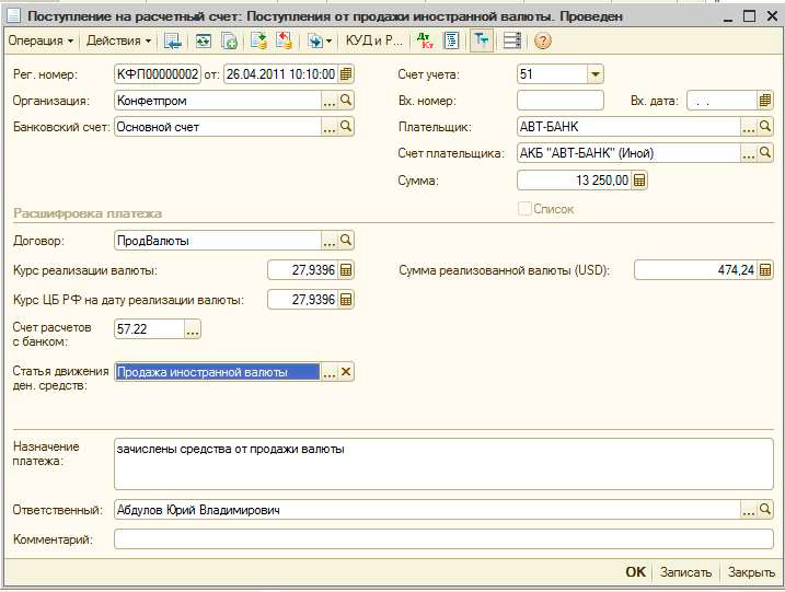 2. Операция зачисления выручки от продажи иностранной валюты на расчетный счет организации регистрируется документом «Поступление на расчетный счет» для операции Поступления от продажи иностранной валюты. В форме документа указывается сумма проданной валюты, курс продажи иностранной валюты, а так же курс ЦБ РФ.