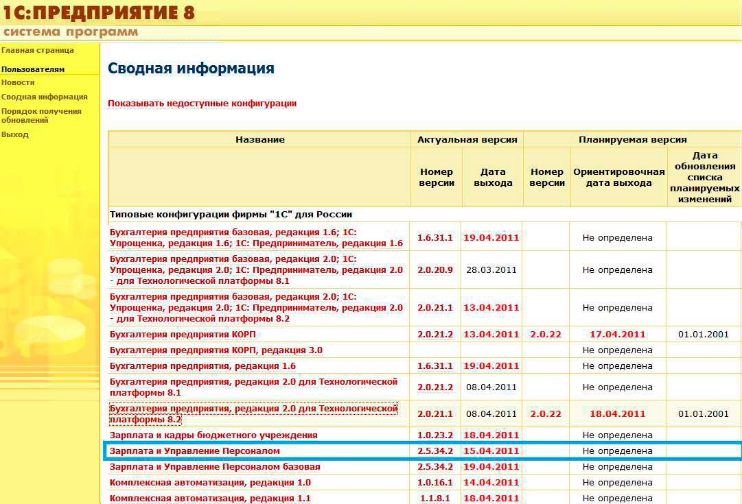 В представленном перечне сводной информации найти необходимую вам конфигурацию. В данной инструкции примером будет служить конфигурация «Зарплата и управление персоналом» для платформы 8.2.