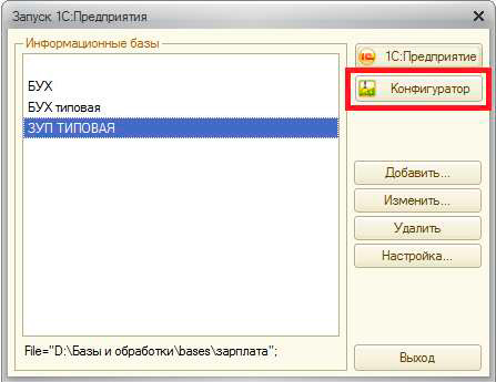После того как будет установлен шаблон для обновления, необходимо обязательно создать архивную копию базы перед тем как осуществлять непосредственное обновление конфигурации 1С 8. Для этого нужно зайти в базу 1С в режиме «Конфигуратор»: