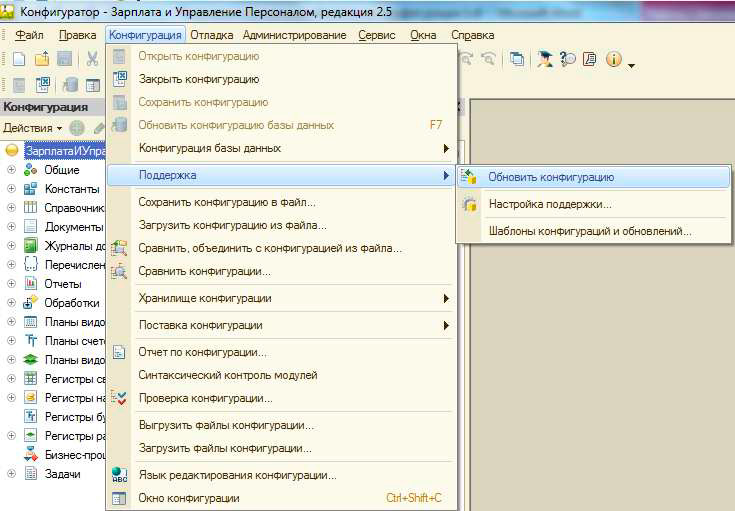 После завершения архивации можно осуществить обновление конфигурации. Для этого необходимо зайти в меню «Конфигурация»/ «Поддержка»/ «Обновить конфигурацию»