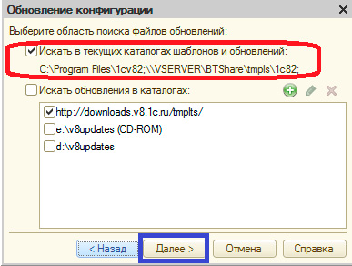 В следующем окне необходимо выбрать область поиска файлов обновлений, в нем установить галочку в пункте «Искать в текущих каталогах шаблонов обновлений» и не устанавливать вторую галочку в пункте меню «Искать обновления в каталогах»