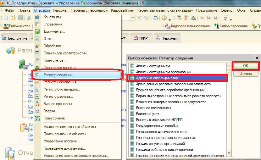 Для осуществления загрузки КЛАДР через интернет в любую из типовых конфигураций 1С необходимо зайти в меню «Операции» - «Регистр сведений» - «Адресный классификатор»: