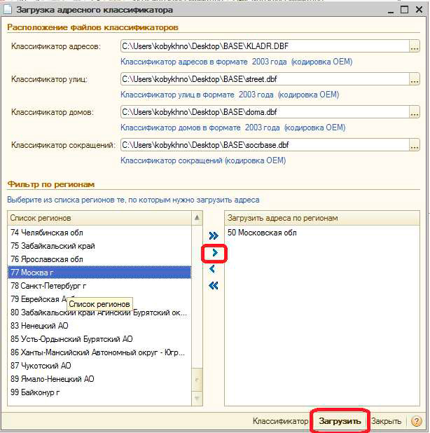 В окне загрузки адресного классификатора необходимо указать расположение файлов для загрузки: