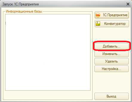 Для осуществления подключения уже созданных баз к платформе 1с, необходимо запустить 1с, и в окне запуска осуществить добавление базы с помощью кнопки «Добавить»: