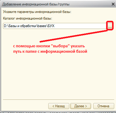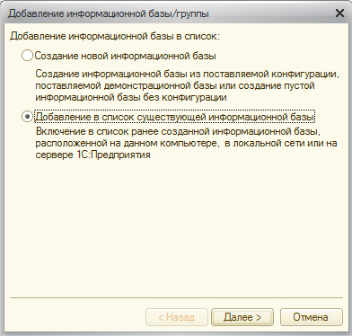 В окне добавления базы необходимо выделить пункт «Добавление в список существующей информационной базы»: