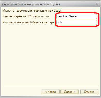 Если будет выбран вариант размещения такой как «На сервере 1С: Предприятия» окно для указания параметров информационной базы будет выглядеть следующим образом: