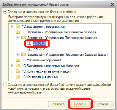 Если создание информационной базы из шаблона, то необходимо выбрать конфигурацию и ее релиз: