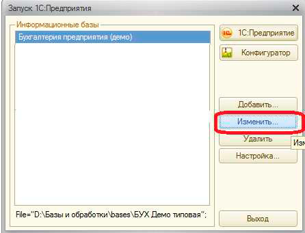 Далее все действия осуществляются так же как при добавлении. Для осуществления изменения пути к базе, необходимо использовать кнопку «Изменить»: